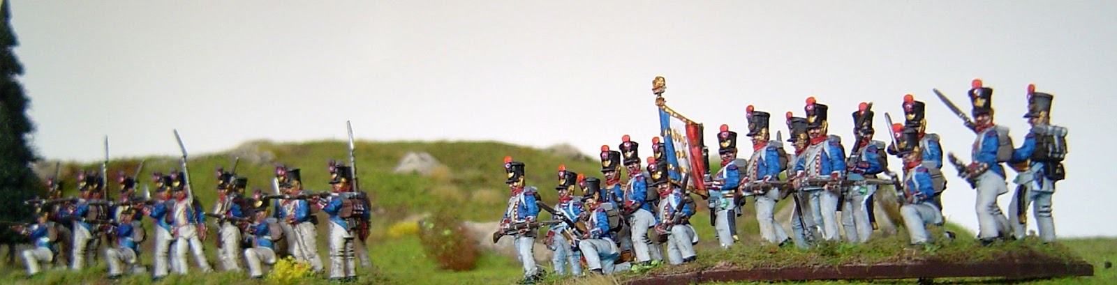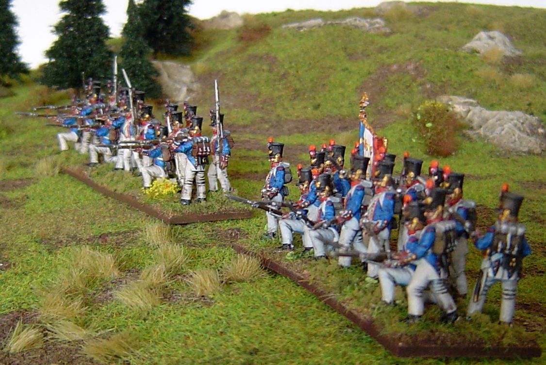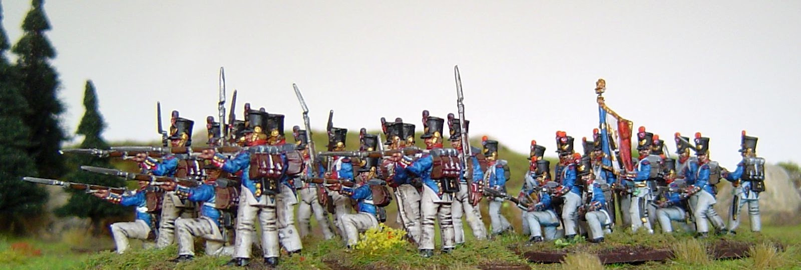 zu Trall: Das Italeri-Set ist sehr gut zusammengestellt. Man bekommt aus einem Set 3 Bataillone ĂĄ 16 Mann. Jedes Bat hat dann allerdings einen Offizier, FahnentrĂ€ger und Trommler. FĂŒr meinen Geschmack könnten mehr Marschierende enthalten sein. FĂŒr die beiden Bataillone habe ich also 2/3 Packungen verbraucht. Bei einem Base sind nur 7 PĂŒppchen drauf. Da habe ich den Fahnenschwenker weggelassen.