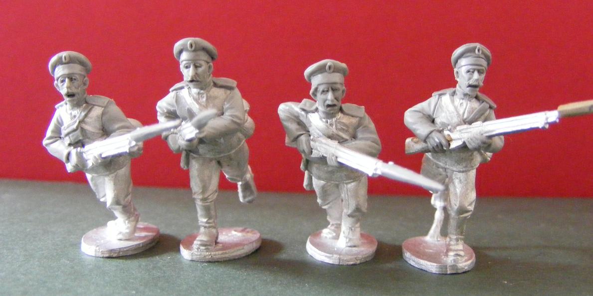 Dieses Mal gibts Standartenträger und Musiker für Russen und Japaner (die Sets werden auch jeweils zwei Bannerspitzen enthalten, von denen ich allerdings noch keine Fotos hab\'), sowie ein Set mit angreifenden Russen. Leider gab\'s ein kleines Malheur mit den Mastern der MGs, so dass diese erst beim nächsten Schwung dabei sein werden.