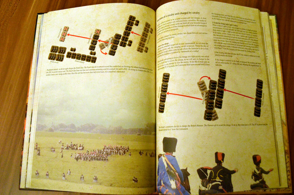 Das Buch teilt sich in verschiedene Teile, den Beginn macht einer kurze geschichtliche Einordnung, die zwar dem Napoleon-Profi keine erhellenden Momente bescheren wird, aber für all diejenigen, die sich mit dem Thema vorher noch nicht beschäftigt haben, eine gute Ausgangsbasis bildet. Nachdem man nun weiß, wo (und wann) man sich befindet, werden erst einmal losgelöst von den eigentlichen Regeln die Grundprinzipien des Regelwerks erklärt. Mit vielen Diagrammen und einigen wenigen Tabellen bekommt man also schon einmal Einsicht in die grundlegenden Regelmechaniken. Ab dem zweiten drittel des Buches beginnt dann der eigentliche Regelteil. Hier gibt es natürlich wenig neues zu berichten, das Buch ist hier so aufgebaut, wie wir es von einem Regelwerk erwarten: zunächst wird ein Zug beschrieben und dann die einzelnen Phasen Schritt für Schritt erklärt. Was mir an dieser Stelle besonders positiv aufgefallen ist: Praktisch jede Regel wird mit bebilderten Beispielen erklärt, meistens auch in mehr als nur einem Beispiel. (meist wird ein mal erklärt was passiert, wenn die Einheit das Vorhaben erfolgreich durchführt und ein mal, wenn es das nicht schaft, weil z.B. ein Test nicht bestanden wurde.) Das ist, gerade für Tabletop-Einsteiger sehr hilfreich und auch \"alte Hasen\" werden das eine oder andere Beispiel als sehr nützlich empfinden. Neben den ausführlichen Regelerklärungen gibt es für jede Phase eine Einleitung in der die Reihenfolge der Abläufe noch einmal genau beschrieben wird. Gerade bei den ersten Testspielen ist es praktisch, auf einen Blick erkennen zu können, wann genau ein Test fällig wird oder wann genau eine Angriffsreaktion fällig ist. Nach dem Regelteil kommt noch der obligatorische Hobbyteil, der aber wirklich nur rudimentär vorhanden ist. Grundlegende Informationen zum Bemalen der einzelnen Truppentypen und deren Uniformen gibt es nicht, diese sind zwar auf den Packungen der Figuren enthalten, was für Einsteiger als gerade mal so eben ausreichend bewertet werden kann. (...dazu später mehr in der Figuren-Review) Alle anderen werden sich wahrscheinlich eh eher auf dieser Seite informieren. Den Abschluss bilden eine Hand voll Szenarien, die eine nette Abwechslung zur offenen Feldschlacht bieten, sowie eine kurze Regelzusammenfassung und (sehr gut) ein ordentliches Stichwortverzeichnis.