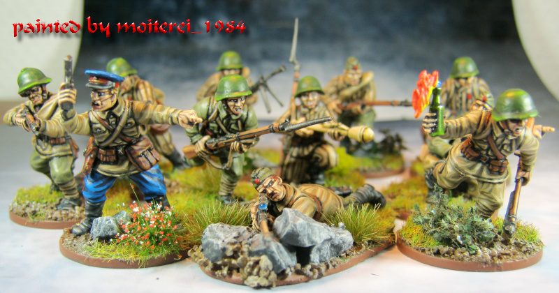 Nachdem ich mir ja auf der Tactica unbedingt die Plaste Russen von Warlord kaufen musste (vielen Dank nochmal an die tolle Reichstagsplatte  :thumbup: ) und ich daraus ja natĂŒrlich auch etwas zumindest halbwegs brauchbares basteln wollte, habe ich beschlossen fĂŒrs erste mal mit einer kleinen 500 Punkte Truppe \"Soviet Rifle Squad\" fĂŒr Operation Squad anzufangen. Verglichen mit ihren anderen Plaste Sets finde ich die Russen echt gelungen. Es hat wahnsinnig viel Spaß gemacht die zu bemalen und was ich am Besten finde: