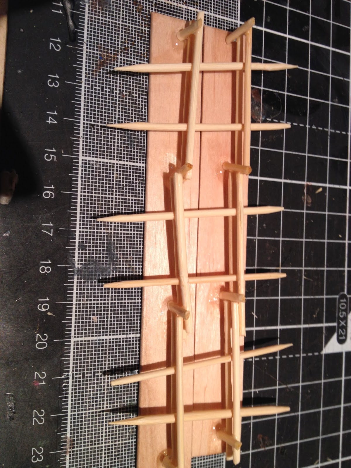 Mit Sekundenkleber dann entsprechend Zahnstocher von den vorhin aufrecht geklebten Zahnstocherteilen Waagerecht ankleben. Dazwischen dann eine weiter Reihe loser Zahnstocher legen.