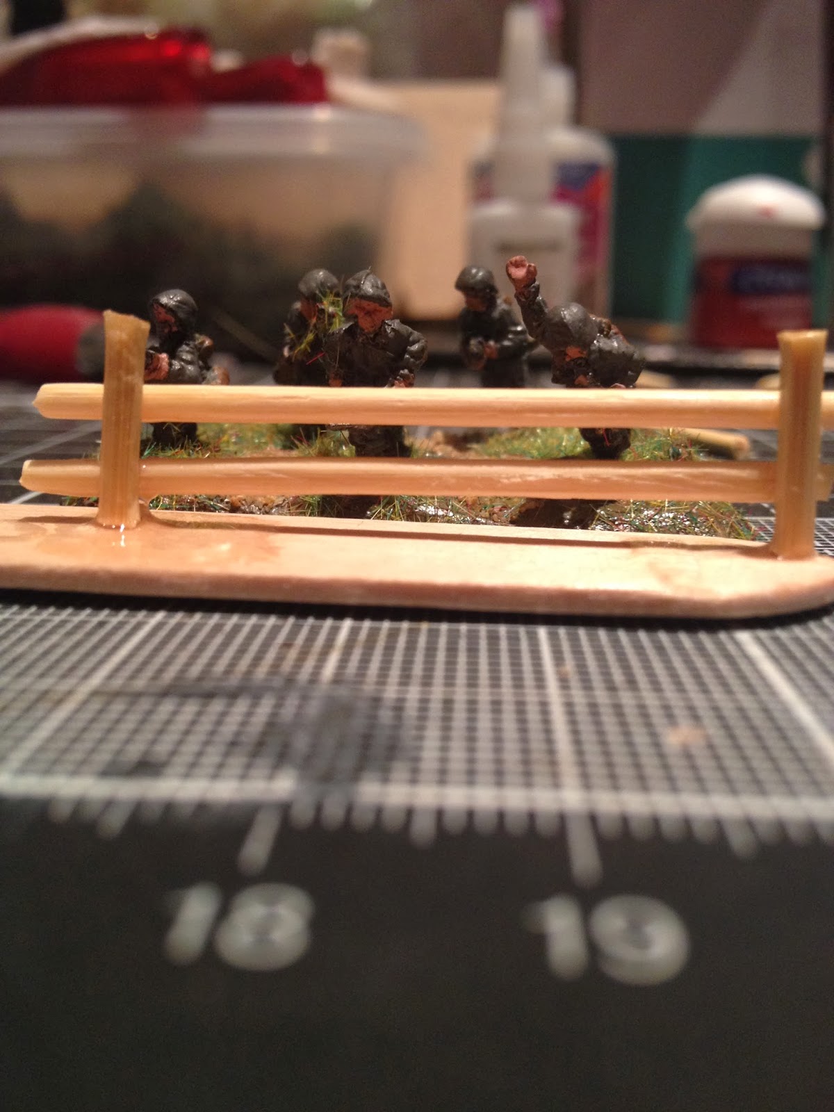 Mikado.... um 180 Grad gedreht Zahnstocher lose auf den Spachtel legen (Ich hab zwei hier genommen). Hintergrund ist, dass der erste Lattenzaun normalerweise nicht auf der Erde liegt.