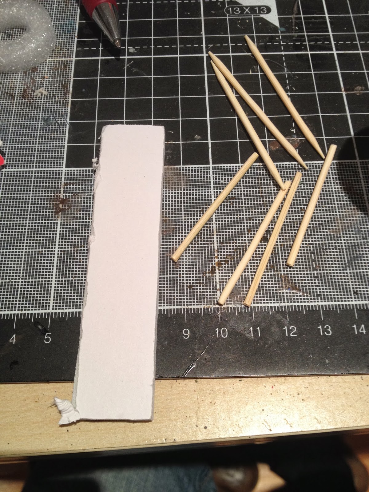 Mit Sekundenkleber dann entsprechend Zahnstocher von den vorhin aufrecht geklebten Zahnstocherteilen Waagerecht ankleben. Dazwischen dann eine weiter Reihe loser Zahnstocher legen.