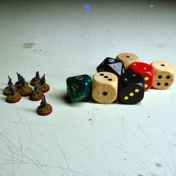 Natürlich brauchen wir Würfel! Bei Altar of Freedom brauchen wir aber wirklich nur eine kleine Menge, praktisch jeder Test wird mit einem W6 geworfen, dazu noch einen W10 bzw. W20 für die Uhr (... die man natürlich auch liebevoll als selbst gebastelte Uhr mit Ziffernblatt selbst bauen kann, aber dazu mehr in einem späteren Artikel) und das war es dann auch schon. Neben den Würfeln natürlich noch ein Maßband, natürlich mit Zollangabe (wir spielen ja schließlich den Amerikanischen Bürgerkrieg!), sowie Marker für die Verluste der einzelnen Einheiten. Das kann alles sein, von den oft benutzten bunten Glassteinen über kleine Kiesel, bis hin zu einzeln basierten Figuren, erlaubt ist was gefällt. Zettel und Stift können nicht schaden, wenn sie auch nicht lebensnotwendig sind, um die Initiative festzuhalten, das kann aber problemlos auch mit einem Würfel oder anderen Markern geschehen, hier muss jeder die Methode heraus finden, die ihm selbst als die beste scheint.