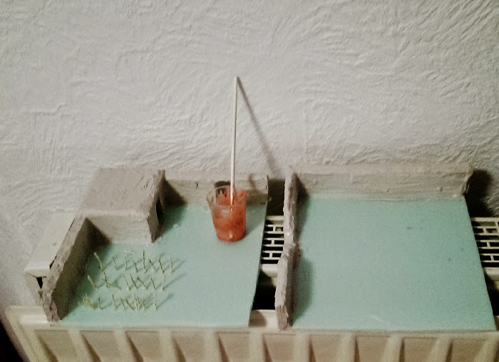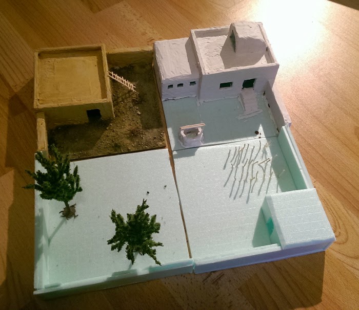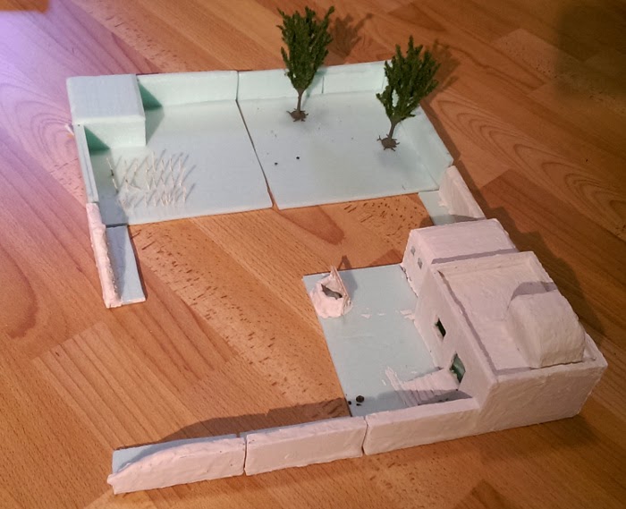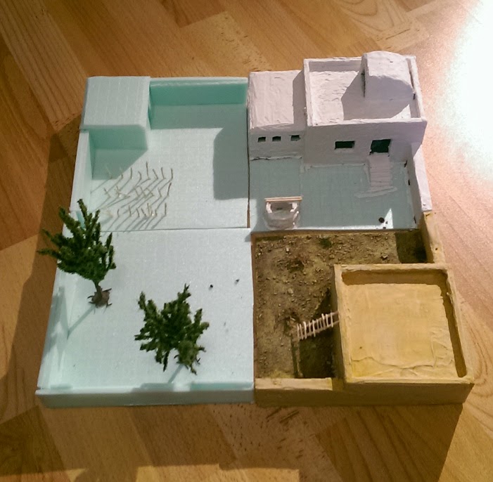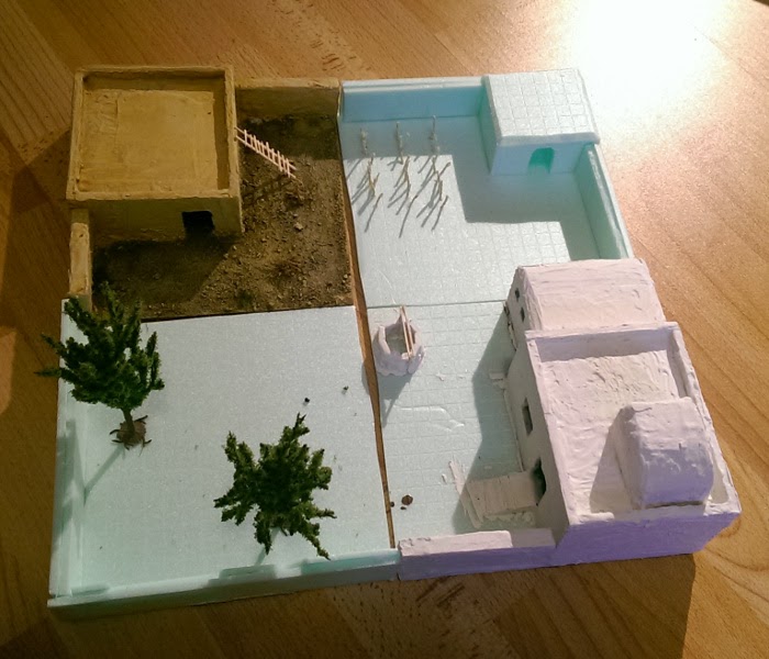 Links ist der Testcompound, bei dem ich die generelle Technik einmal von Anfang bis Ende durchprobiert habe, um das Ergebnis auf optische Tauglichkeit und StabilitĂ€t zu prĂŒfen. Ist im Moment noch etwas simpel und bekommt noch Sonderausstattung und Details dazu (zB eine Leiter), aber der grobe Look steht so.