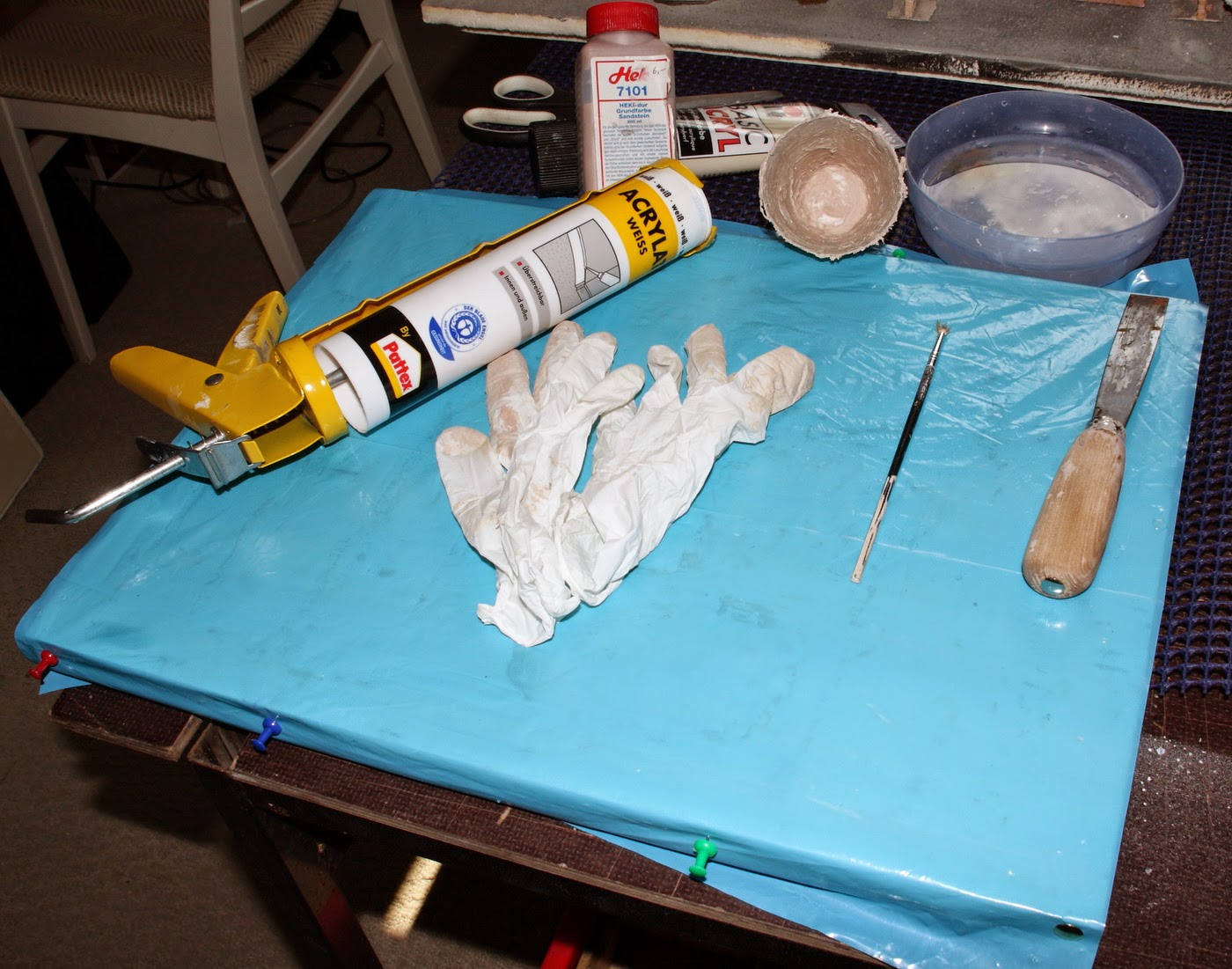 Werkzeug benötigen wir Acrylpistole, Einweghandschuhe, einen Stock/ Borstenpinsel, kleinen Spachtel, eine Schale mit Wasser, ein Gefäß zum Vermischen des Acryls mit Farbe, Acrylmalfarbe und natürlich handelsüblichen Acryl. Natürlich sollte Streumaterial nicht fehlen.