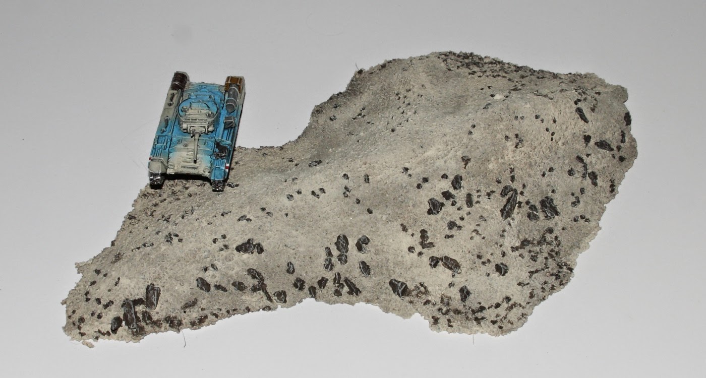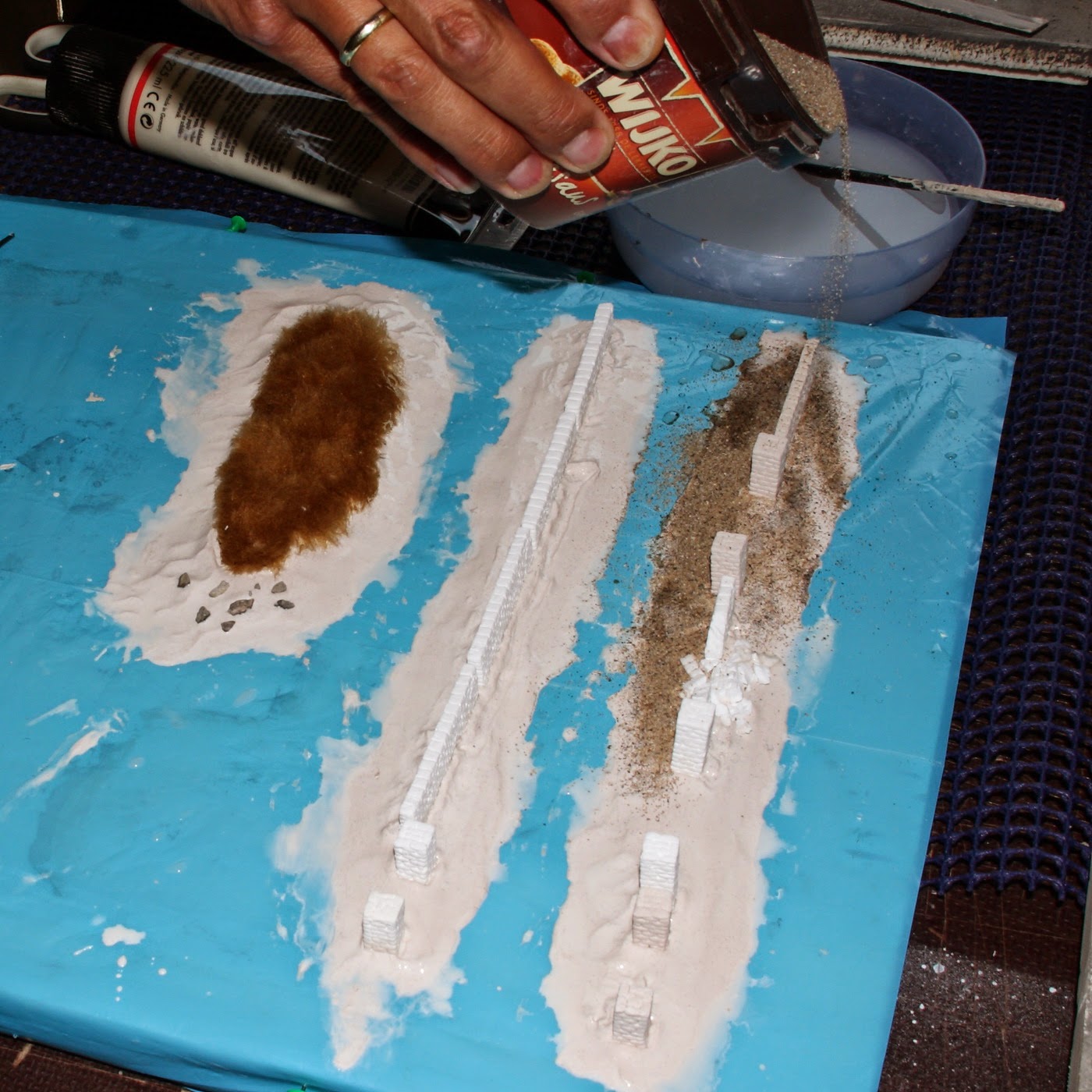 Ich selbst habe noch keinerlei Erfahrung mit dem Bestreuen mit Grasfasern, aber andere Modellbauer haben da schon positive Ergebnisse erzielt. Ich verwende für meine Wüstenbase unterschiedlich fein gesiebten Sand und Splitt.