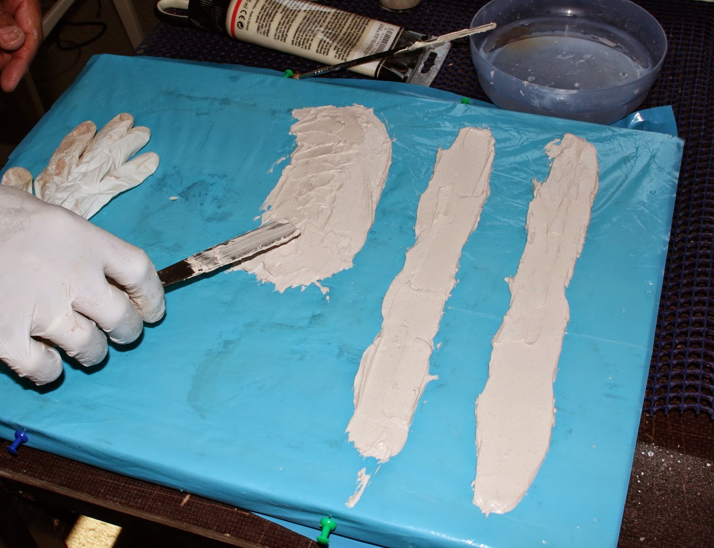 Nun die Acrylmischung mit dem Spachtel auf die Plastikunterlage auftragen.