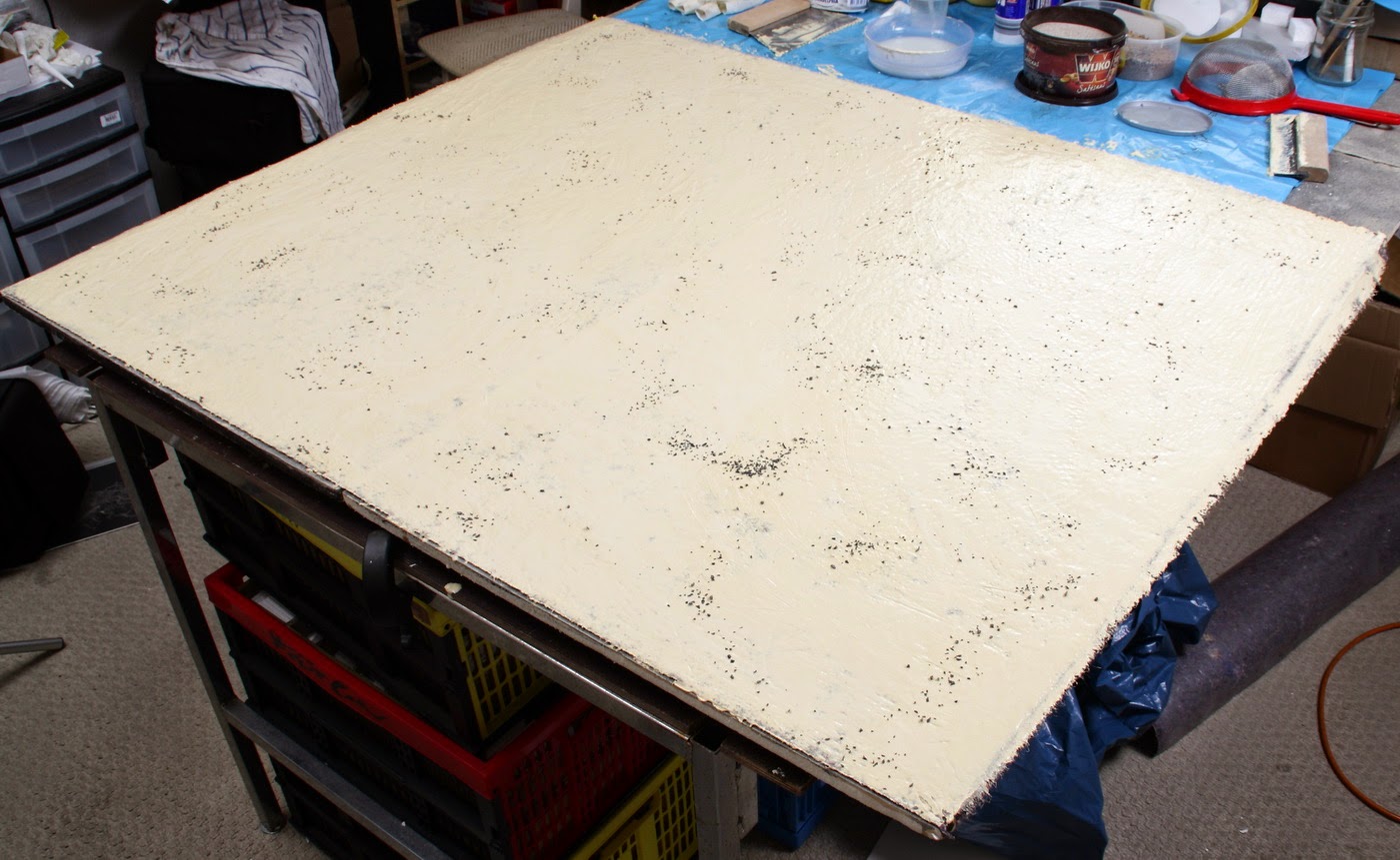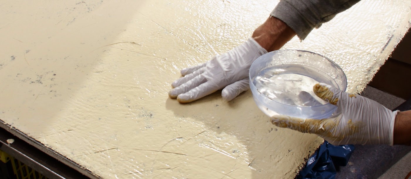 Nun wird die Fläche mit dem Gummispachtel unter hinzugabe von etwas Wasser glattgestrichen.