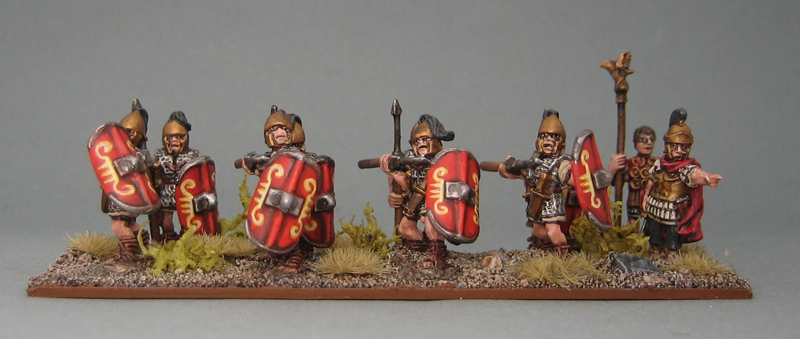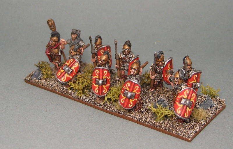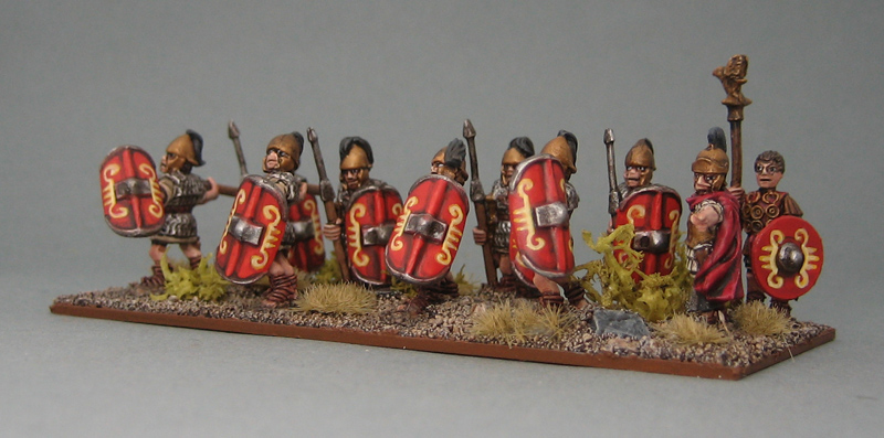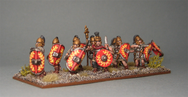 Mein erster Ausflug ins historische Wargaming besteht aus einer 15mm-Rom-Armee von Corvus Belli. Die Figuren sind für Basic Impetus gebased, ich habe sie aber bisher nur nach den Regeln für Kings of War von Mantic gespielt. Als Gegnerarmee habe ich Karthago gesammelt, die Jungs sollen also frühe republikanische Römer sein, was aber von den Modellen nicht ganz passt (und ich glaube, von der Schildbemalung auch nicht - das hat mich vor fünf Jahren noch nicht so interessiert ...).
