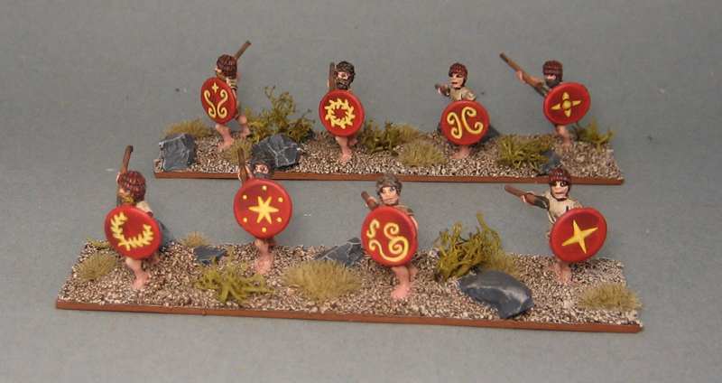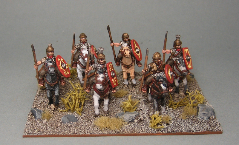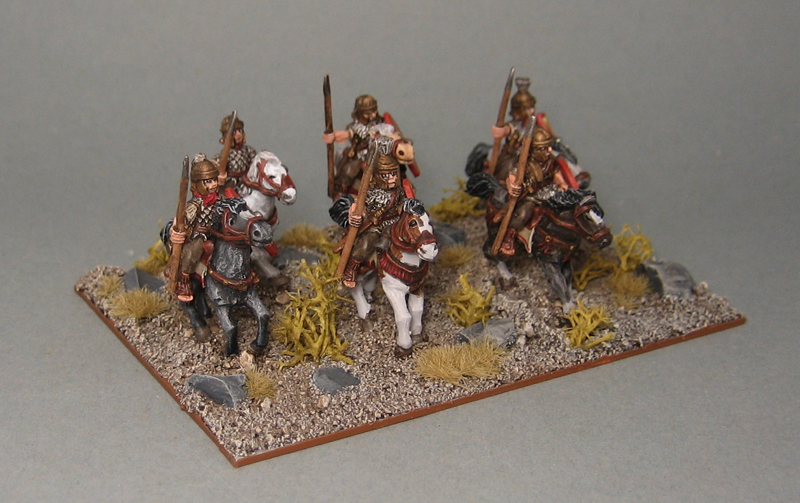 Nach längerer Überlegung habe ich mich für eine Bewaffnung mit Spatha, Schild und Kurzbogen entschieden. 3 Modelle haben den Bogen in derHand, die anderen haben das Schwert gezogen. Die jeweils anderen Schilde und Bögen werden noch an die Sättel geklebt.