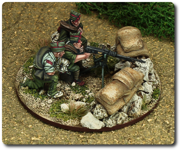 @Stahlprophet: Nein, da sind keine Washes im Spiel, bzw. nur beim Metall der Gewehre. Washes machen eine Miniatur \"dreckig\" bzw. man muss seine eigenen Washes ansetzen um diesen dreckigen Look (der je nach Stil des Malers auch gut aussehen kann) zu verhindern. Ich mag lieber saubere/ leuchtende Farben und benutze Washes nur ganz selten und wenn dann, sehr gezielt. Dafür benutze ich vornehmlich Vallejo Farben und eine Nasspalette, auf der ich bis zu sieben leicht veränderte Farbnuancen anmische, d.h. vom Schatten bis zum hellsten Licht eines bestimmten Teils der Miniatur.