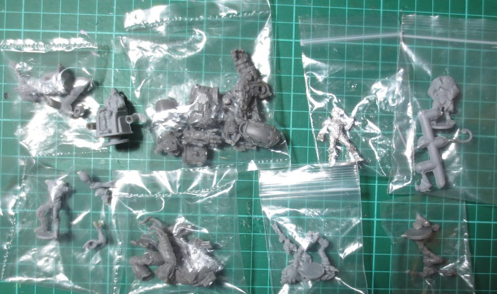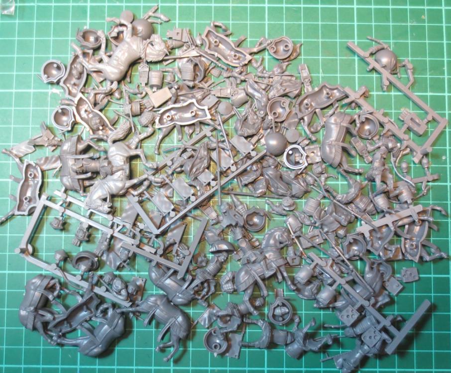 Eine TĂŒte voller ĂŒbriggebliebener Teile fĂŒr Samurai von Wargames Factory. Auf den ersten Blick lassen sich ca. 10 berittene Samurai und eine Hand voll FußgĂ€nger bauen...