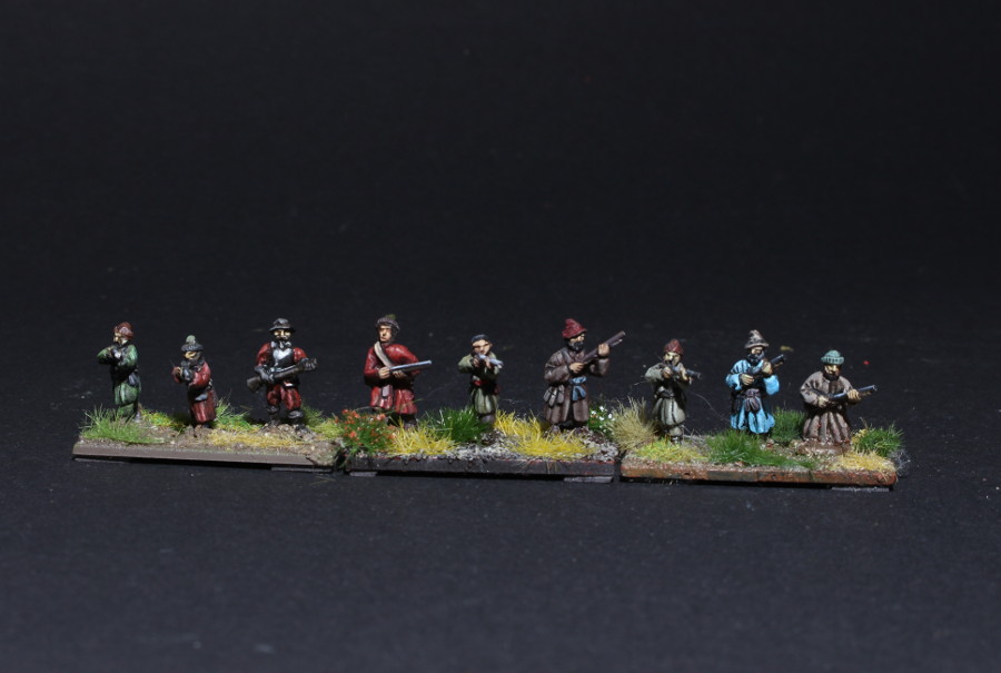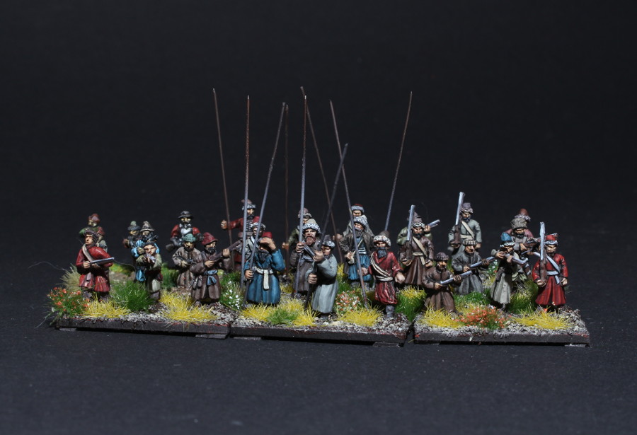 [align=left]Gleichzeitig habe ich natürlich auch etwas Infanterie aufgebaut. Hier war die Auswahl nicht ganz so eingeschränkt - es gibt ein paar sehr hübsche Cossacken in 15mm, die man für Russen gut verwenden kann. Die besten, die mir bisher in die Hände gefallen sind, sind Totentanz Figuren. Wirken vtl. etwas zu wohlhabend für Moskowiter Cossacken...