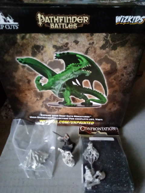 der grüne wizkids Drache, der confi zwerg, zwei Warhammer Minis, und eine Zwergenmini