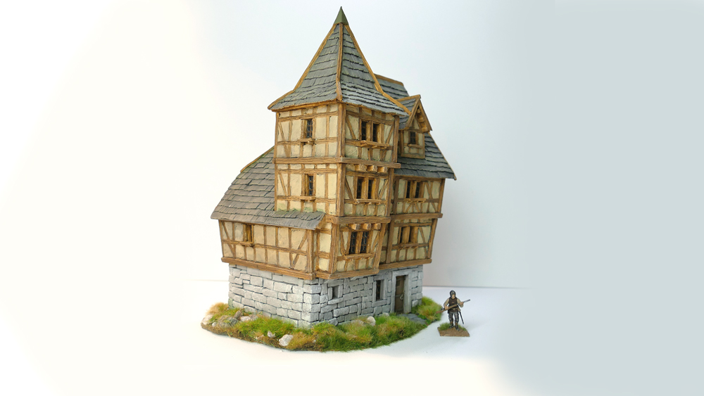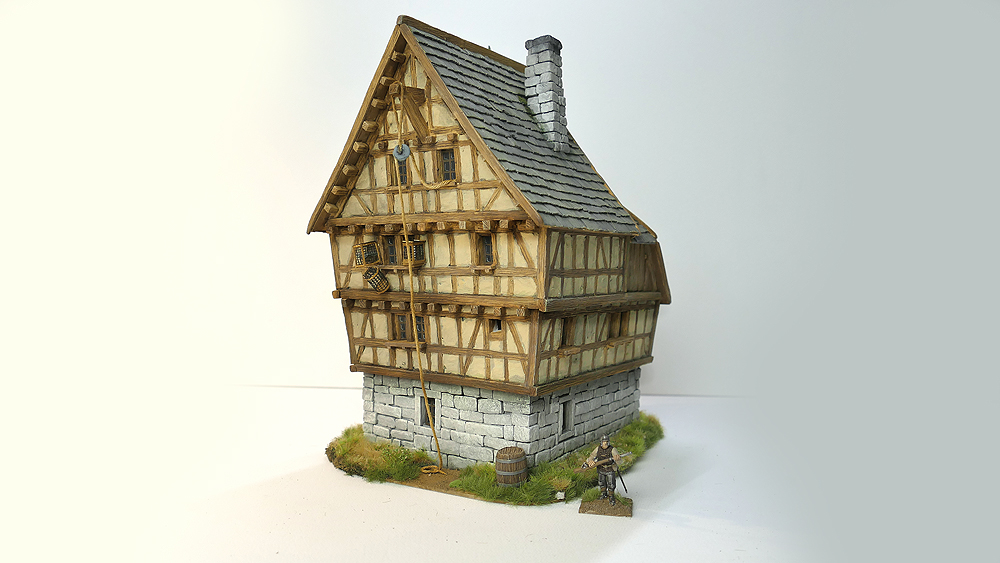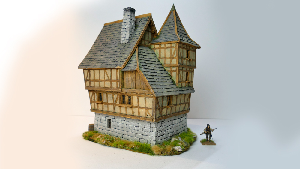 nach langer Zeit habe ich mich mal wieder an ein einem Tabletop-Gebäude (28mm) versucht. Das Gebäude besteht nur aus Styrodur, Karton und Gips. Alle Styrodurteile sind per Hand geschnitten, also ohne Thermoschneider.  Die Putzflächen zwischen dem Fachwerk sind dann ausschließlich mit Gips / Spachtelmasse gemacht worden. Der Zeitaufwand für so ein Gebäude lag bei knapp 20h. Das Ergebnis sieht dann so aus.