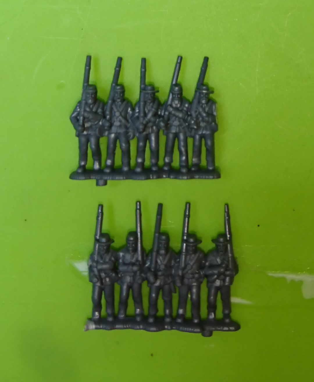 Mit den drei Rahmen der WI habe ich schon jeweils 7 Einheiten zu je 2 Bases, je eine Scharfschützeneinheit mit einer Ein-Streifenbase und jeweils eine Freiweilligeneinheit mit nur einer Base.
