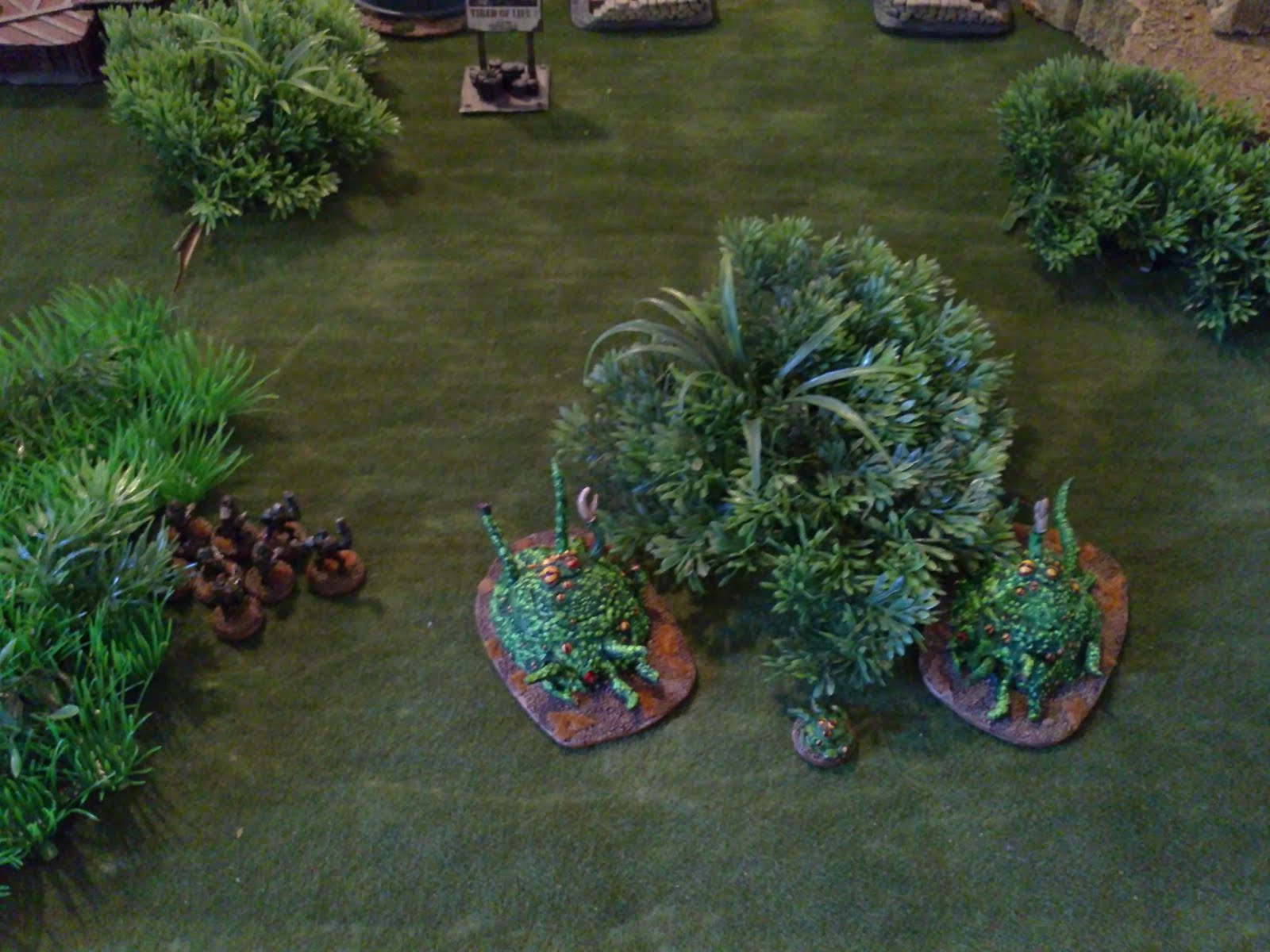 (a) 15mm Sci-Fi auf einer großen Platte. Riesenmonster, Schlangenmenschen, Kriegsläufer, aerodynamische Gleiter, gebäudegroße Panzer und Aliens unterschiedlichster Farbe haben sich auf einem Dschungelplaneten fetteste Gefechte geliefert. Wolfslords Abschied aus Berlin in einem großen Feuerwerk. Mit dabei das meiner Meinung nach schönste Geländestück Berlins: ein aus Raumschiffswrackteilen gezimmertes Beduinenzelt (scratchbuilt by Wolfslord). Ich werde dieses Geländestück vermissen.
