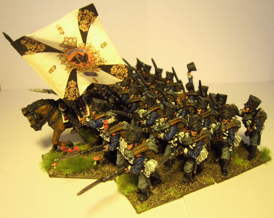 Soweit ich mir recht erinnere, gab es 1813 einen königlichen Befehl, dass berittene Offiziere abzusitzen hatten, wenn das Bataillon die Formation zum Plänkeln auflöste. Die Ursache dafür lag in den hohen Verlusten unter den berittenen Offizieren im Frühjahrsfeldzug, vor allem bei Großgörschen. Es ist daher ein guter Kompromiss, die Füsilierbataillone nur mit abgesessenen Offizieren darzustellen.