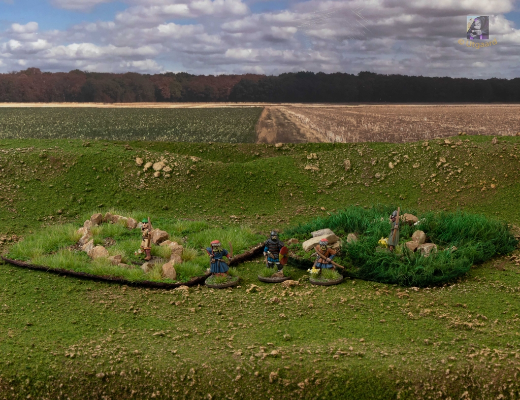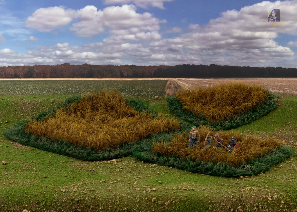 Dazu dann noch ein paar Geländestücke in den Abmessungen für SAGA aus Teddyfell. Einerseits läßt sich damit hohes Gras und Weizenfelder ziemlich überzeugend darstellen, der Stoff paßt sich dem Untergrund gut an und - ich brauch eh noch Übung damit, bevor ich mich an eine komplette Matte aus Teddyfell mache.