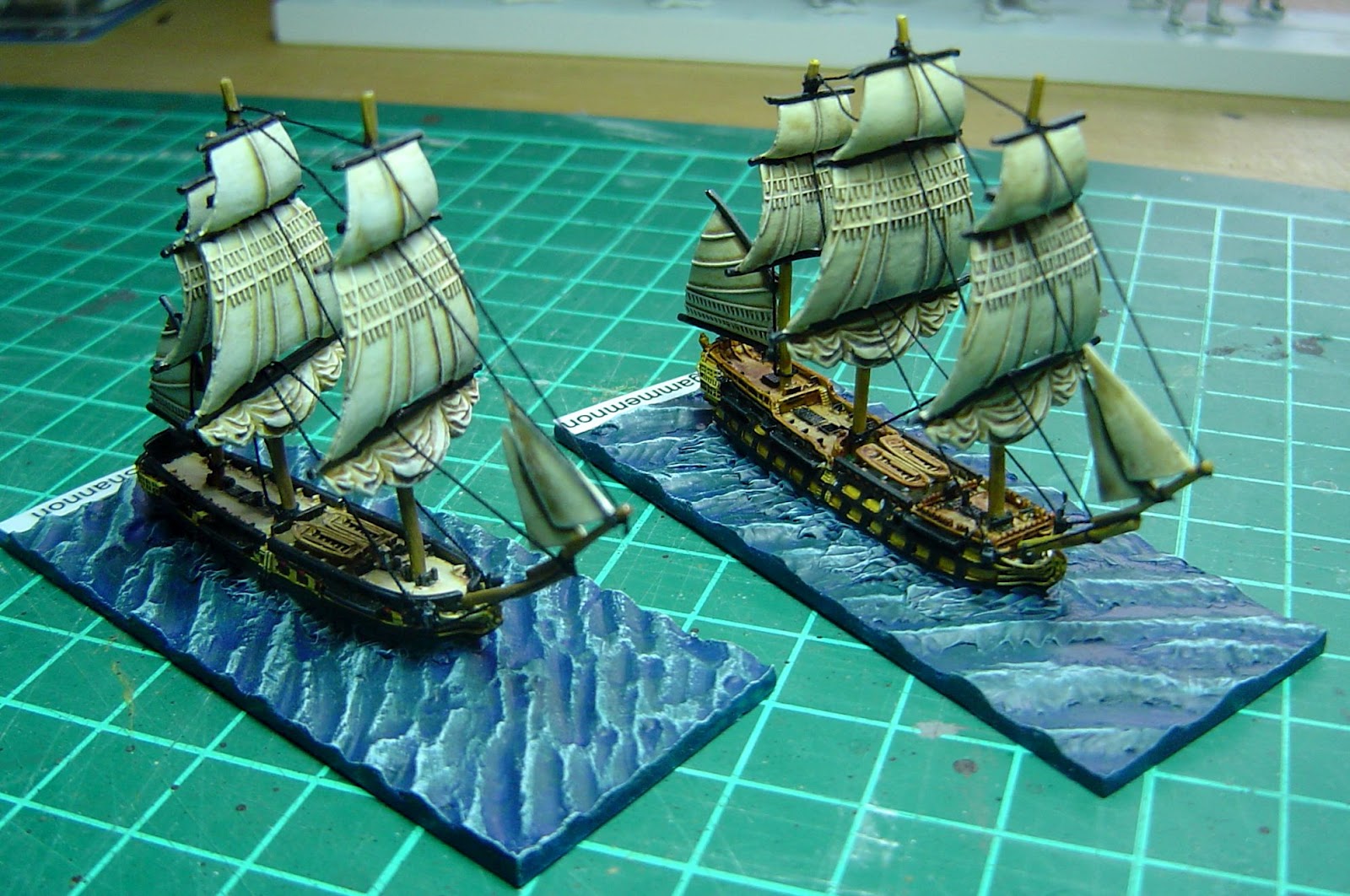 Sicherlich sind die Langton Messing Segel filigraner, aber wahrscheinlich auch fissiliger zu basteln. Wanten wären auf jedenfall noch eine sinnvolle Ergänzung, ansonsten sehen deine Schiffe sehr gut aus. Besonders deine Basen gefallen mir. Wie hast du diese gemacht?