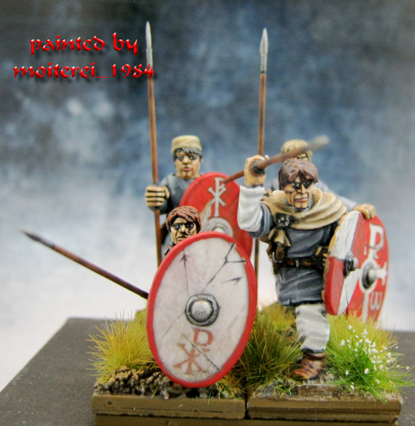 So, die Tage habe ich wieder ein paar Limitanei bzw. wohl eher Pseudocomitatenses fertig bekommen. Die letzten vier stehen schon auf dem Maltisch und warten nur noch auf die letzten Pinselstriche. Danach bin ich fĂŒr\'s erste durch mit den Jungs. Fehlen dann nur noch 16 Warrior (aka Comitatenses) und 4 Hearthguard (Aka Scholae Palatinae oder Praetorianer um auch den frĂŒheren Ausdruck zu benutzen)