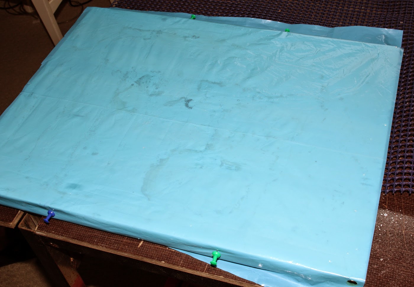 Auf den Untergrund wird eine aufgeschnittene Plastiktüte aufgespannt.