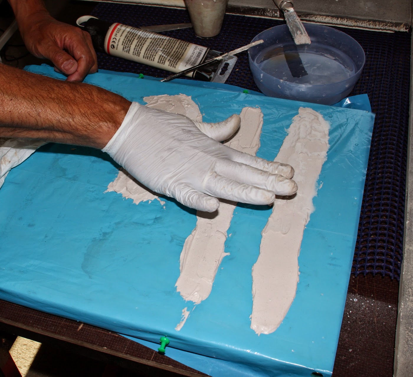 Nun die Acrylmischung mit dem Spachtel auf die Plastikunterlage auftragen.