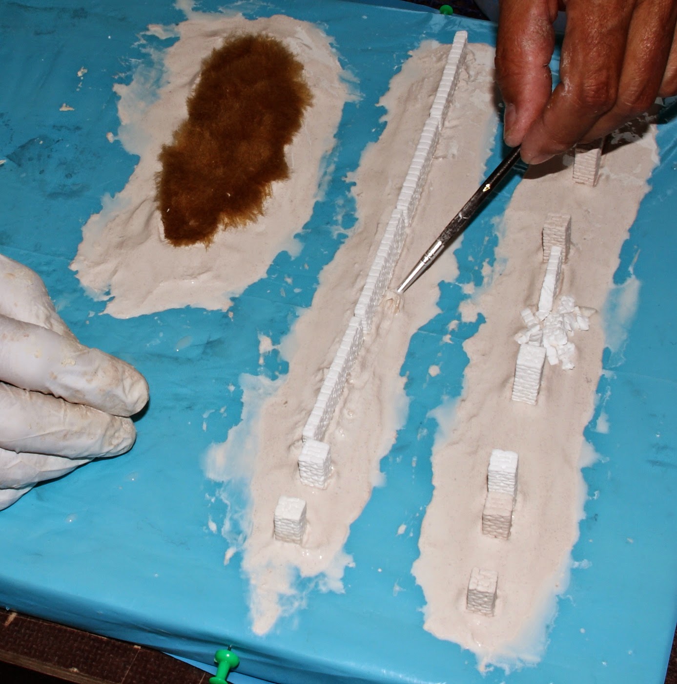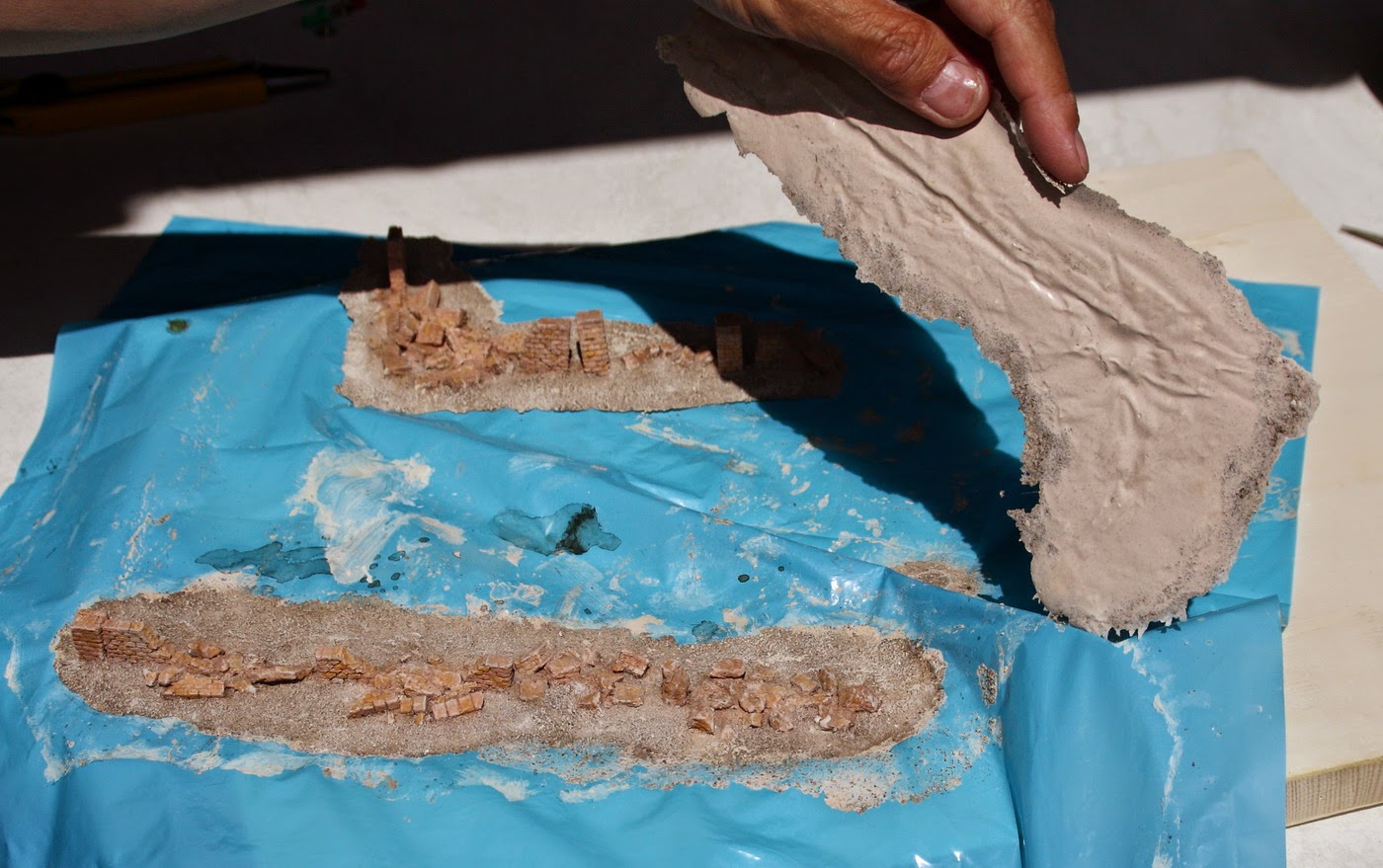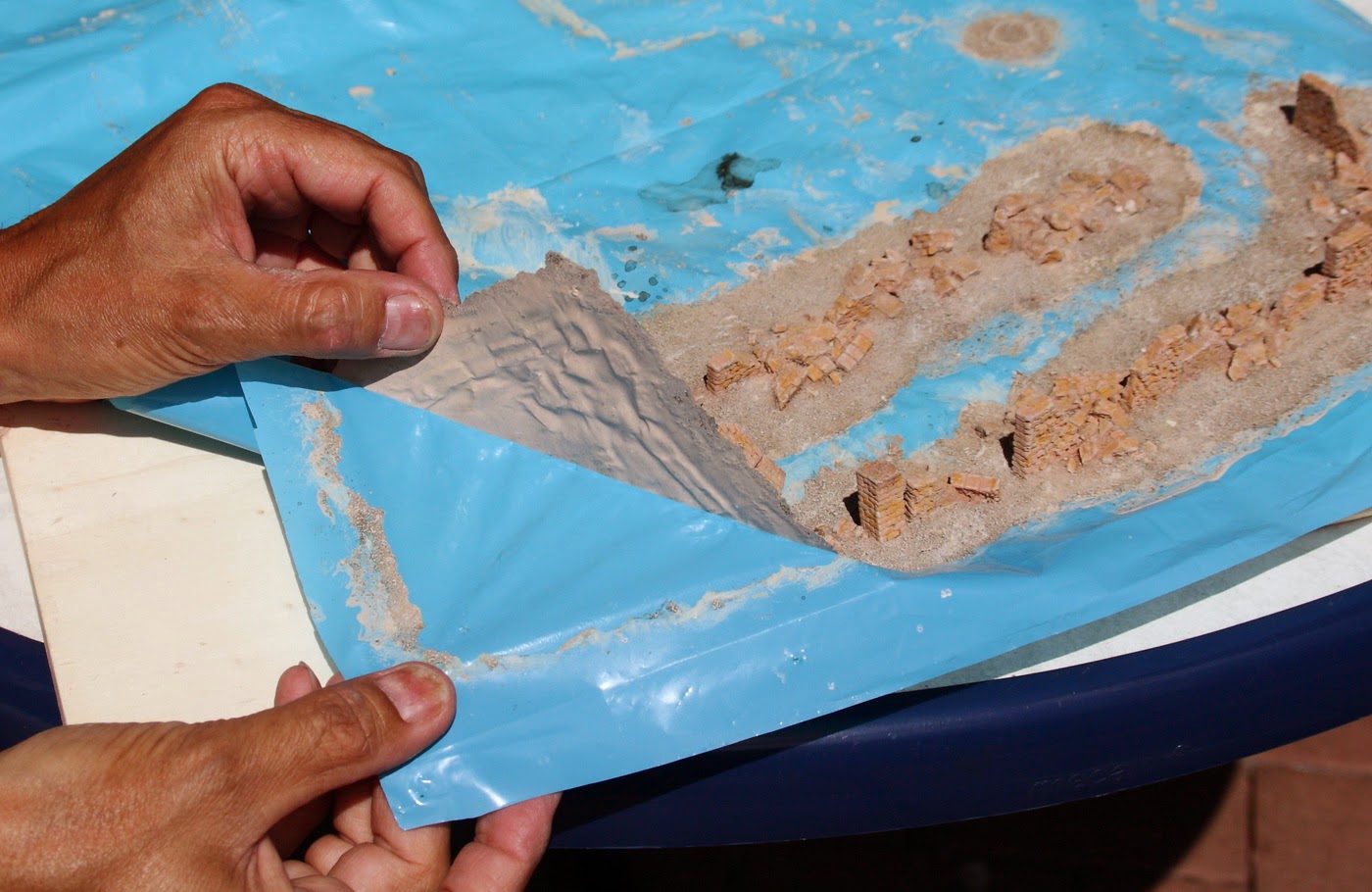 In der Zwischenzeit, wenn die Oberfläche an getrocknet ist kann man schon mal das eine oder andere bemalen. Ich bemale in der zeit die Mauern und den Sandboden, sodass es vom bemalen vor dem abziehen fertiggestellt ist.