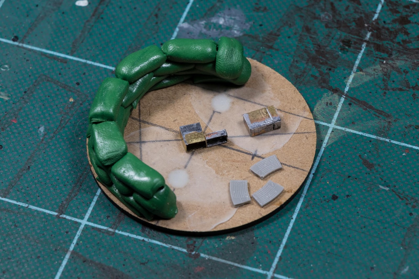 Für die Base habe ich noch ein paar Munitionskisten aus einem Messingbausatz gelötet, sowie Sandsäcke aus Green Stuff für eine angedeutete Stellung.